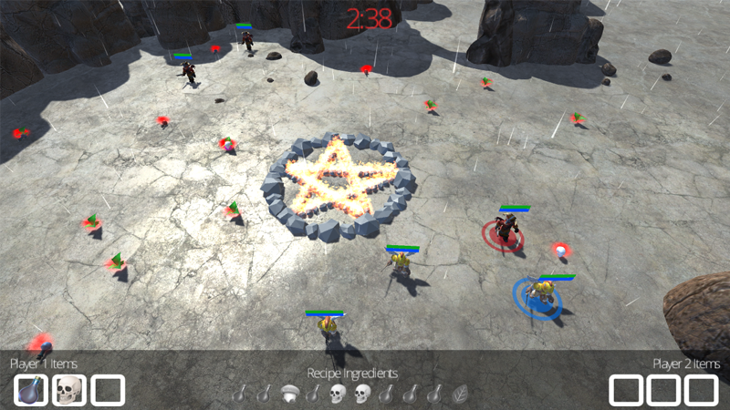 Angels Hate Demons is a local 1vs1 multiplayer game where one player controls the demons, while the other controls the angels. The objective of the demons is to collect the necessary ingredients to complete a demonic ritual before the time runs out. On the other hand, the angels need to stop the demons from doing so by any means necessary. The players can control only one character at a time, and can only switch to the next one when that character dies. Each players had a total of 3 character, from which two of them are light warriors, and one of them a heavy warrior. All warriors, both demons and angels have a light and fast attack, a slow and heavy attack and fireball attack.