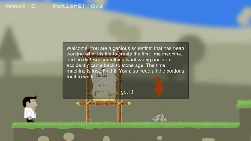 Transci is a simple and short game about a genius scientist who by mistake goes back in time, during the stone age. However, uppon his arrival he quickly realizes that the time machine is lost. So, the scientist begins a journey to find the time machine and go back home. Unfortunately, he needs to be very careful of the tough terrain and wild cavemen.